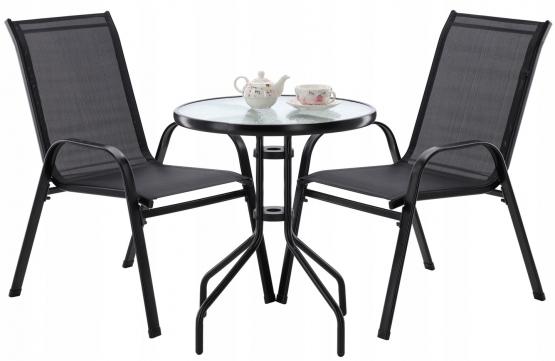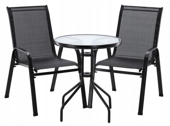 Komplektas puikiai tiks ieškantiems klasikos ir elegancijos derinio. Paprasta forma ir stilinga pintinė konstrukcija suteikia subtilaus žavesio ir leidžia baldams prisitaikyti prie bet kokios aplinkos – balkono, terasos ar sodo. Stalas su grūdinto stiklo mozaikos faktūros stalviršiu yra patvarus ir ilgaamžis. Tvirtas, tankiai pintas tekstilės audinys užtikrina komfortą ir atsparumą. Puikiai tiks ne tik asmeninėse erdvėse, bet ir komercinėse vietose.
