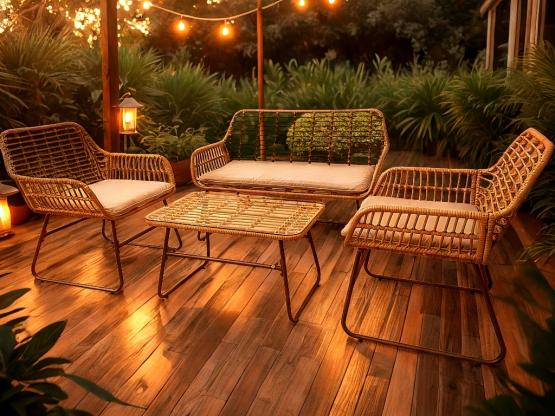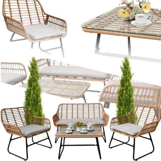 Stilingas ir funkcionalus sodo baldų komplektas – idealus pasirinkimas vertinantiems eleganciją, komfortą ir ilgaamžiškumą. Puikiai tinka terasoms, balkonams, sodams, pavėsinėms bei komercinėms erdvėms – kavinėms, restoranams ar viešbučių poilsio zonoms. Aukštos kokybės sintetinis rotangas elegantiškos rudos spalvos derinamas su tvirtu cinkuoto plieno rėmu, užtikrinančiu atsparumą oro sąlygoms ir korozijai.